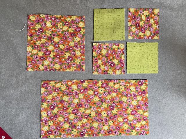 Og i bundfarven skal du bruge 2 firkanter på 6 x 6 cm, samt en firkant på 10.5 x 10.5 cm og en på 10.5 x 21 cm.