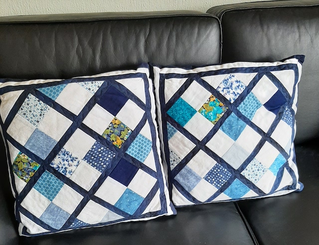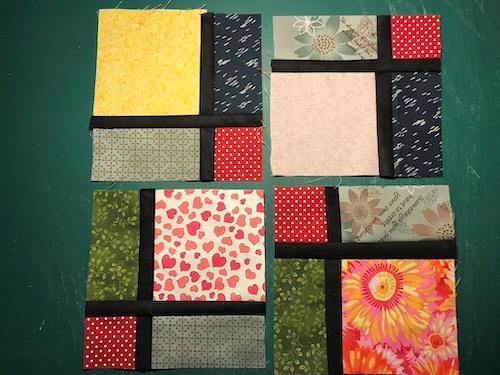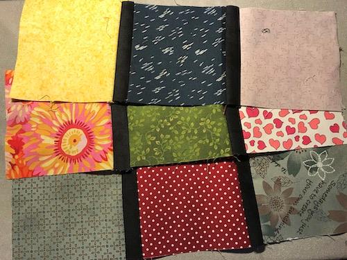I patchwork sprog en "nine patch" - nemlig 9 lige store firkanter i en blok + her fået en lille tvist.