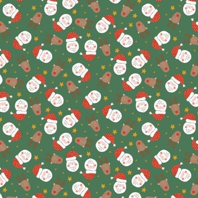 Nisser og rensdyr ansigter på grøn patchworkstof  er et meget smukt 100% bomuld patchwork stof der er 110 cm bred. Dette meget smukke jule patchwork stof har grøn bundfarve med masser af små søde nisse og rensdyr ansigter i alle retninger.