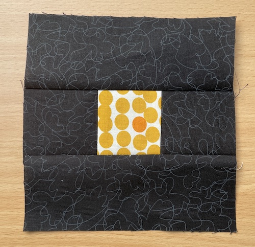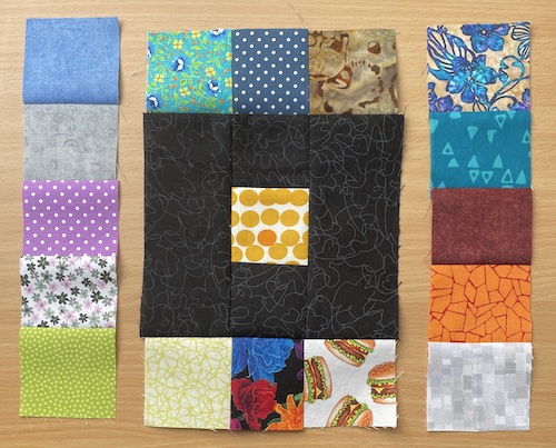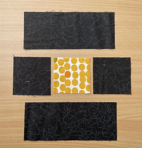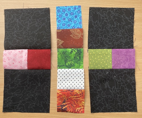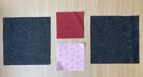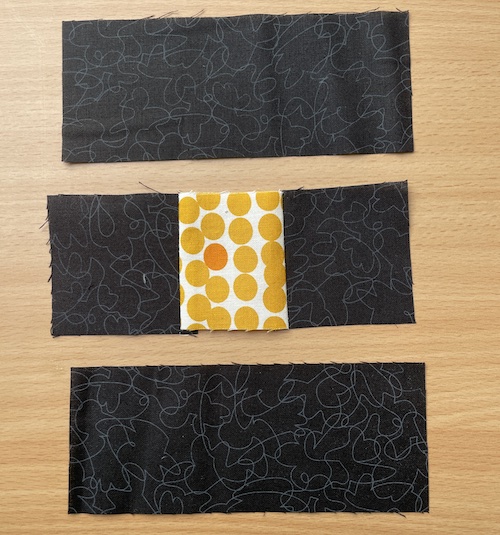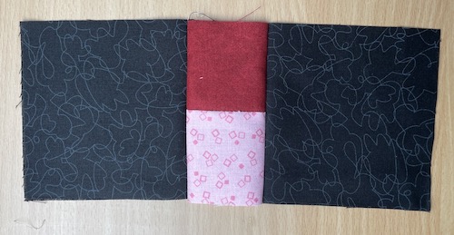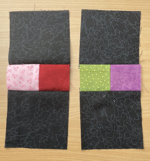 Start med at sy to firkanter i reste farver sammen og sy en sort firkant på i hver side.