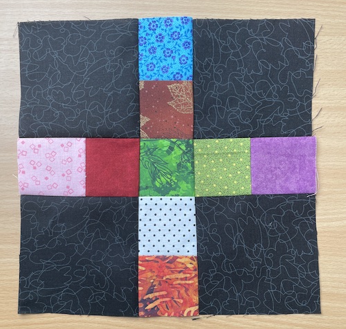 Forside » Gratis DIY og Inspiration » Patchworktæpper med danske bynavne 🇩🇰 » Restetæpper opdelt i de figure de er syet i » Restetæpper syet af 3 figurer » På kryds og tværs med Langå restetæppe