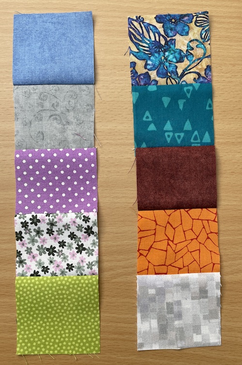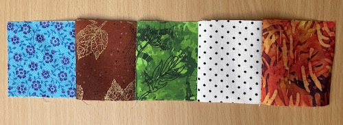 Tag derefter de 5 x firkanter og sy dem sammen til en lang strimmel