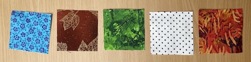 Samt 9 firkanter på 6 x 6 cm i rester farver.