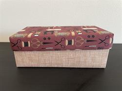Med sine indre mål på 7,5 cm i højden og 10,5 x 22 cm i bredde og længde, giver æsken dig rigeligt med plads til f.eks. rulleskærere, målebånd, større sakse, små stofbundter eller andre voluminøse redskaber, der ellers kan være svære at finde plads til. Den aflange form gør den samtidig nem at placere i en reol eller have stående på sybordet.