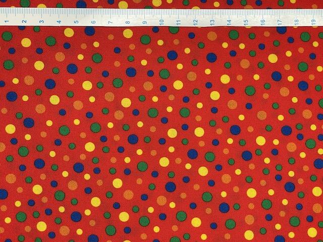 og har en flot rød bundfarve med masser af blå, grønne, gule og røde prikker/bomber
