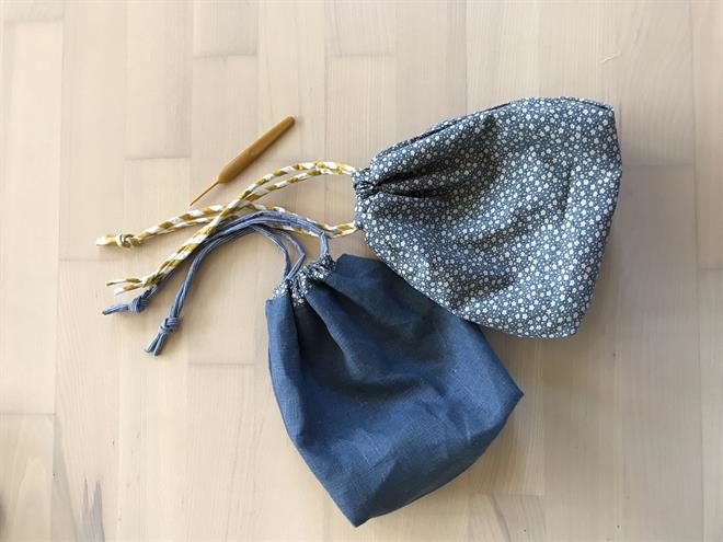 Mønster på en lille projektpose, der er vendbar, har trekantbund og stofsnor.