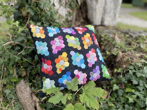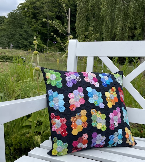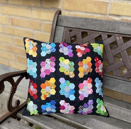 Forside » Gratis DIY og Inspiration » Gratis vejledninger - trin for trin. » Mini sekskanter håndsyet med mange muligheder » Pude med mini 6 kanter - håndsyet