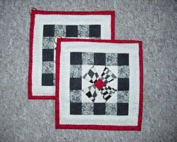 Det er et Pedari patchwork mønster, som indeholder papskabeloner til et par grydelapper, lige klar til at klippe ud. Randi Grydelapper - Mønster 139 Fåes også som dækkeserviet og brødserviet. Husk at bestille mellemfoer til dine grydelapper her