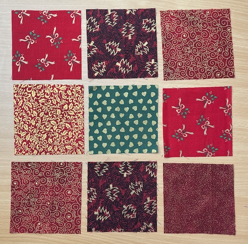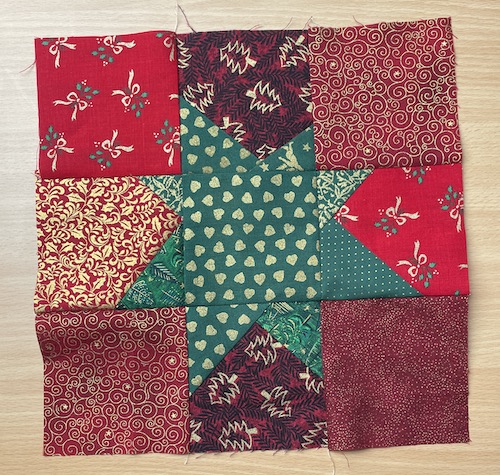 Mit juletræstæppe består af 16 blokke, 8 stk af hver farve.