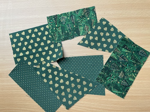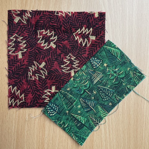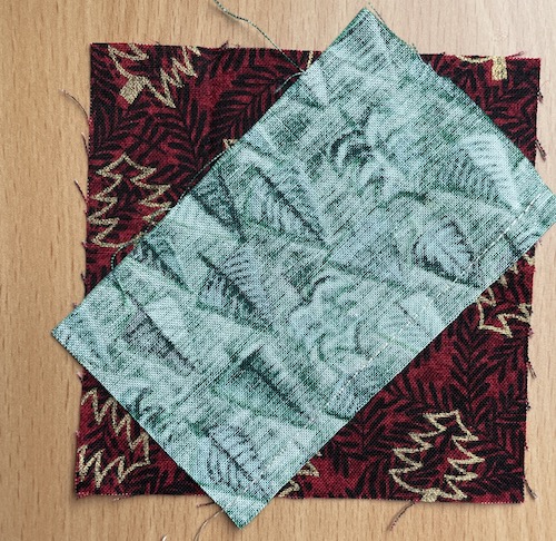 Start med at sy tilfældigt et stykke grøn rest på den ene røde firkant.