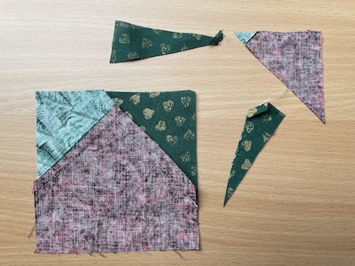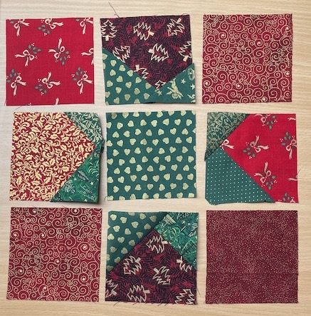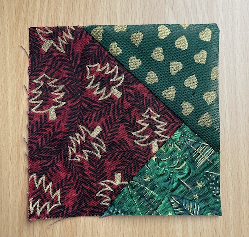 Start med at have den grønne firkant i midten og find de 4 røde firkanter der nu skal syes "trekanter" på.