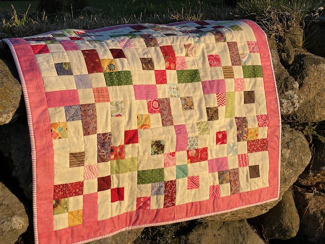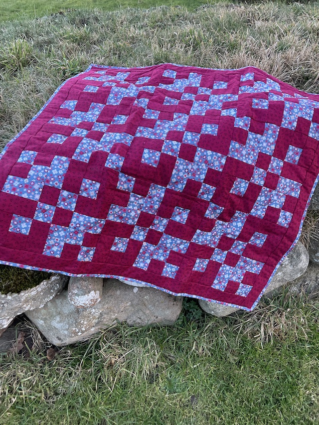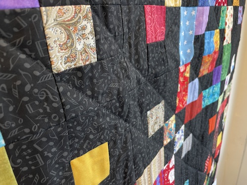 Her mit sorte tæppe fra en skæv vinkel så du kan se jeg har quiltet med sort quiltetråd.