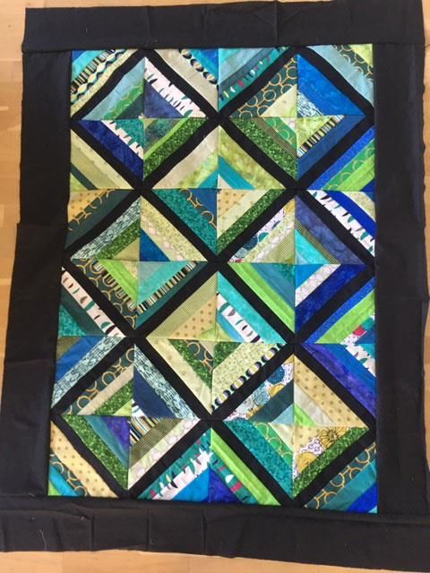 Det varmer mit lille patchwork-strimmel-hjerter at hun går i gang og inden for en uge har syet dette meget flotte tæppe af sinde blå og grønne rester.