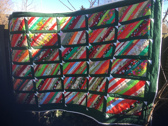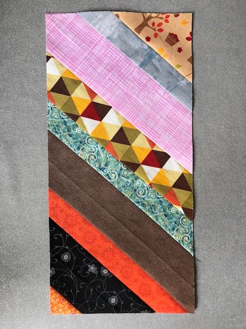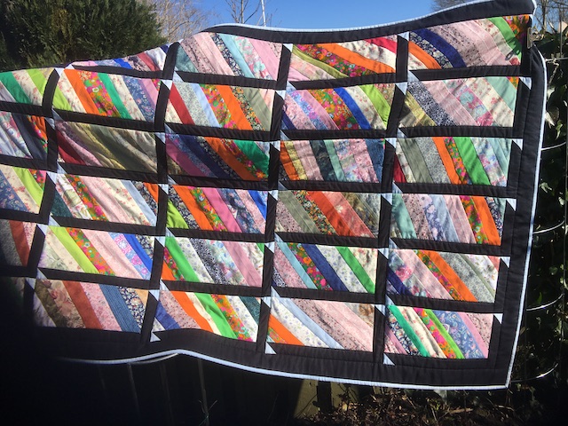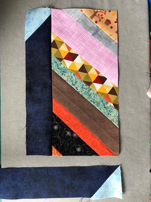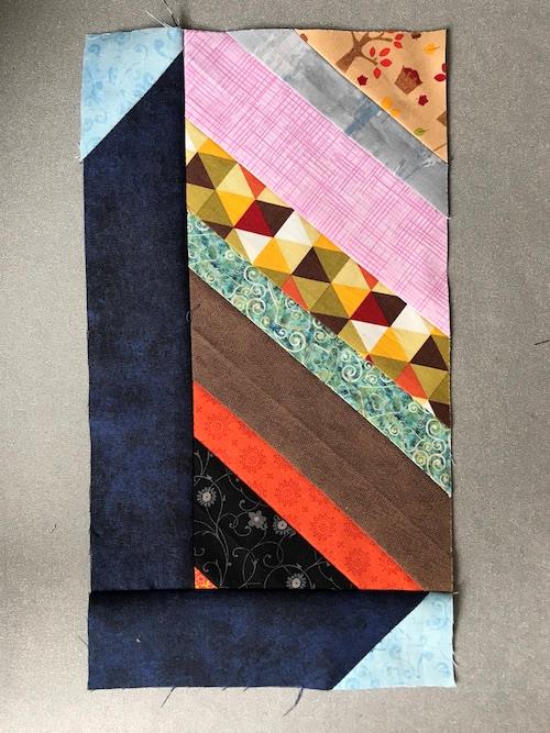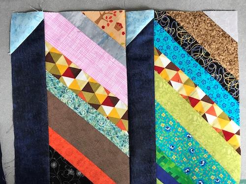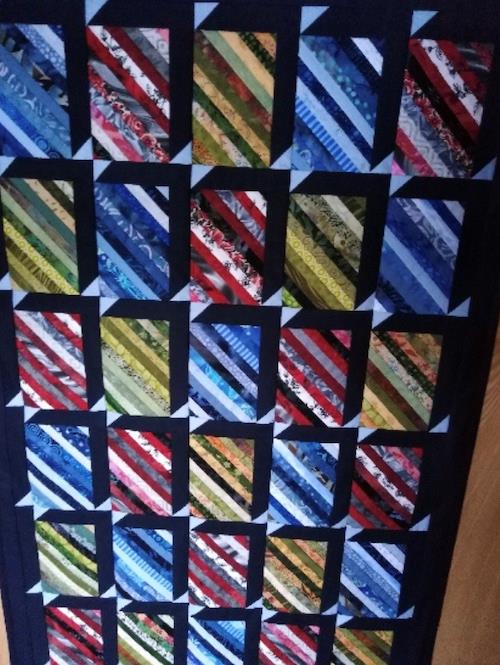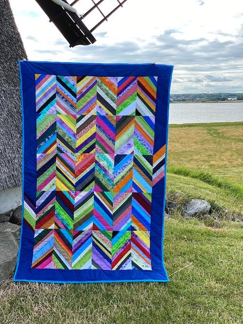 I dette skrå restetæppe er alle blokkene syet den samme vej.