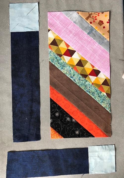 Det er en masser strimler syet på skrå på L11 ( vliseline) og med blå kanter og trekanter omkring.