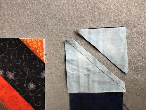 De er skåret 5 cm brede. De små trekanter der skal syes på måler 5 x 5 cm.