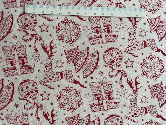 Dette meget flotte stof har forskellige røde jule motiver, som julepakker, julekugler, stjerner mm
