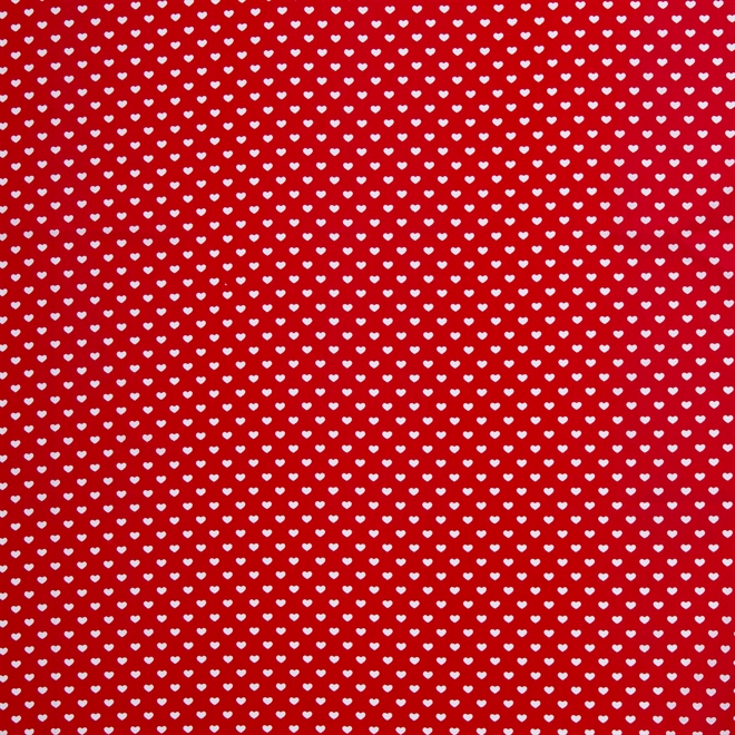 Dette meget smukke rød bomuldsstof har rækkevis af hvide hjerter.