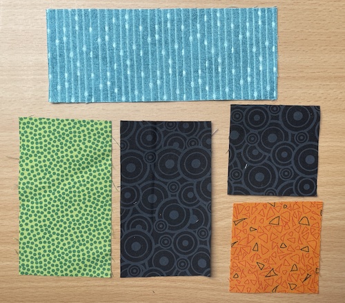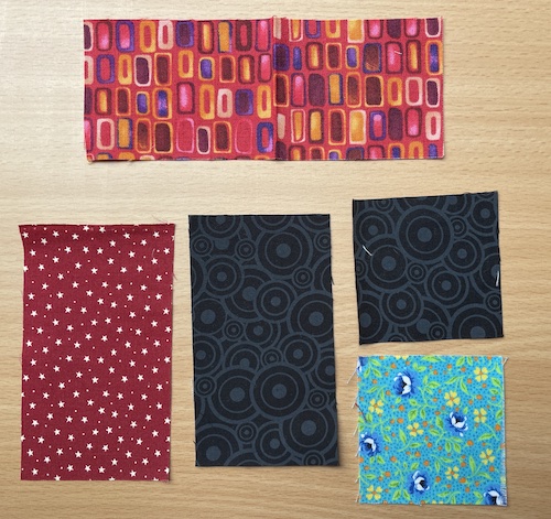 5 x 5 cm, 5 x 10 og 5 x 15 cm . Husk at klippe stoffet med 1 cm sømrum.