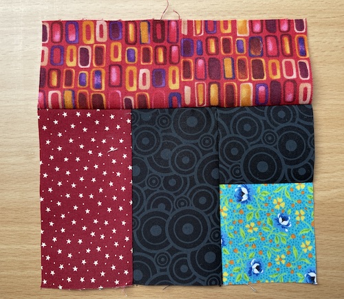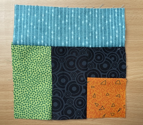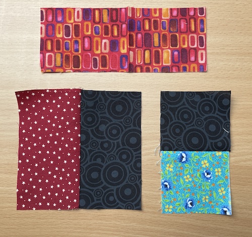 Start med at sy de stykker på 6 x 10.5 cm sammen og de 2 stykker på hver 6 x 6 cm sammen.