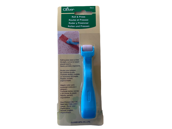 Prisen er for et stk. rulle- og presseværktøj fra Clover , med lyseblåt håndtag og en længde på ca. 12 cm. En lille, men effektiv hjælper, du hurtigt ikke vil undvære i dit syværksted.