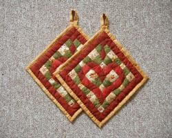 grydelapper håndsyet af små firkanter og danner et hjerte