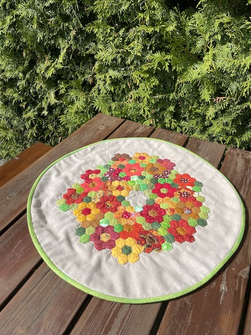 Forside » Gratis DIY og Inspiration » Gratis vejledninger - trin for trin. » Mini sekskanter håndsyet med mange muligheder » Rund dug med håndsyet blomster i 6 kanter.