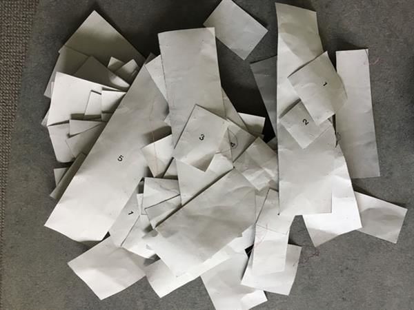 Nu rier du så en masse skabeloner, så du har til hele forsiden af dit patchwork projekt. Når du har syet det hele sammen, presse du det hele let og piller dine papskabeloner ud. Det gør du nemmest med at bruge en syl eller en kraftig nål og hiver din sytråd ud med. Det kan se sådan ud, når alle ens papskabeler er pillet ud.