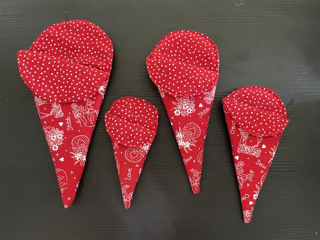 Sakse Etui sykit i 4 størrelser. Dette sykit indeholder 2 røde patchwork stof,