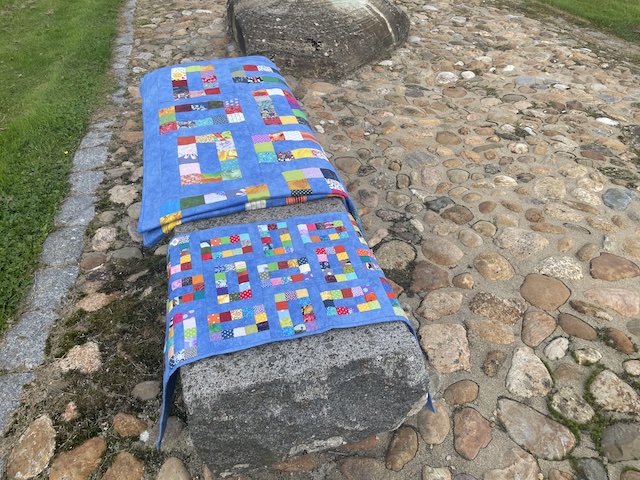 Forside » Gratis DIY og Inspiration » Patchworktæpper med danske bynavne 🇩🇰 » Dækkeservietter mm i stofrester efter bynavne tæpper » Smuk løber efter Bogense tæppet - håndsyet
