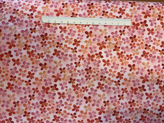 Dette flotte stof har et lys rosa bundfarve og masser af små rosa, lyserøde og orange blomster.