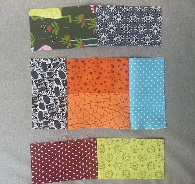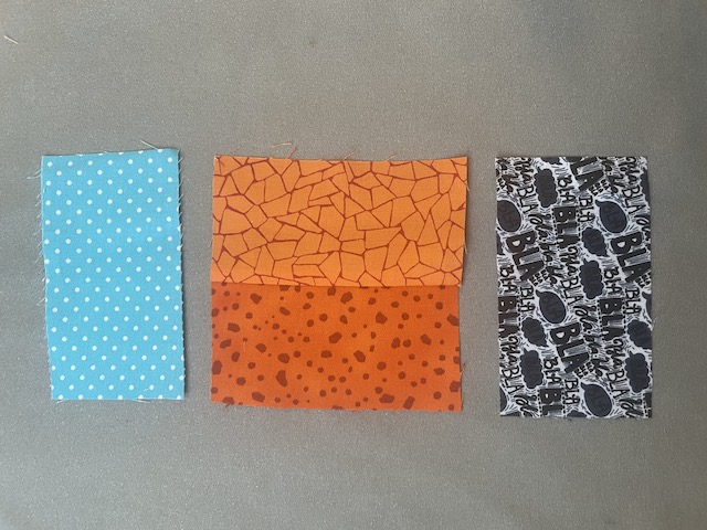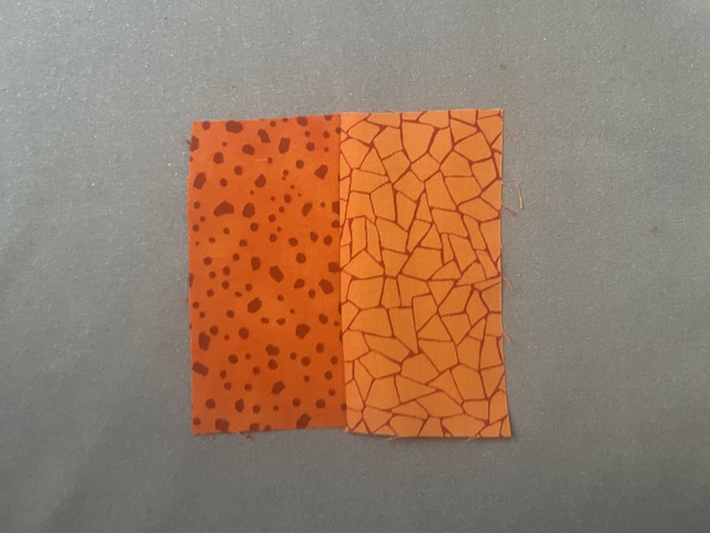 Jeg har 4 forskellige orange patchworkstoffer i hele tæppet, men alle er blandet imod hinanden.