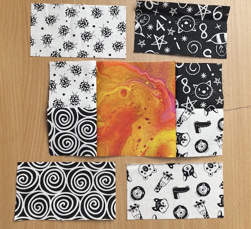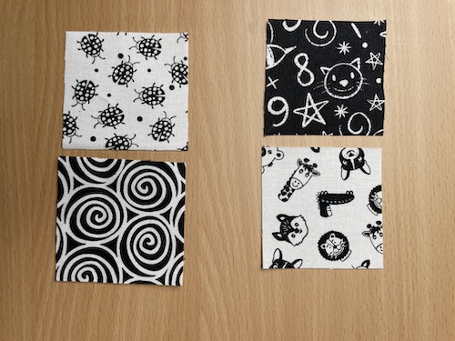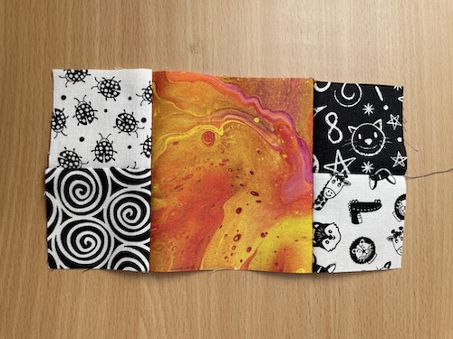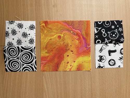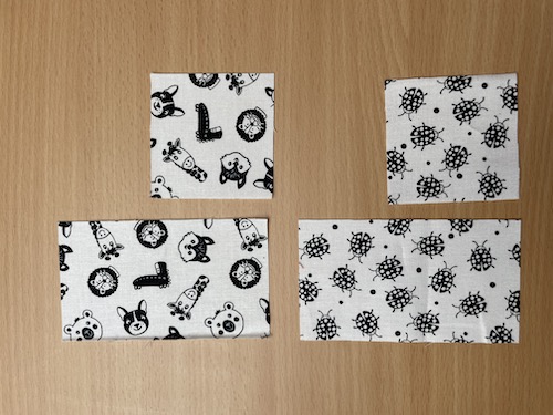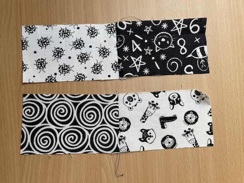 Her starter jeg med de 4 firkanter på 6 x 6 cm og syr dem sammen 2 og 2 ( en af hver)