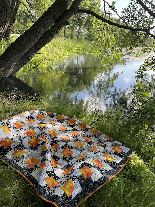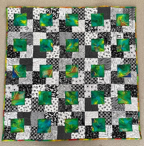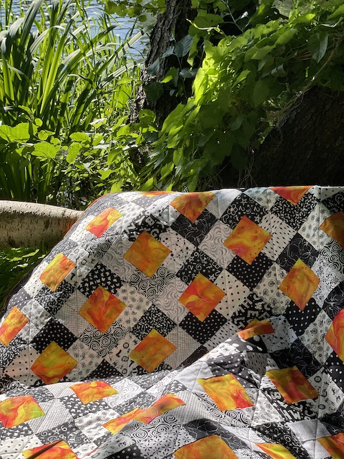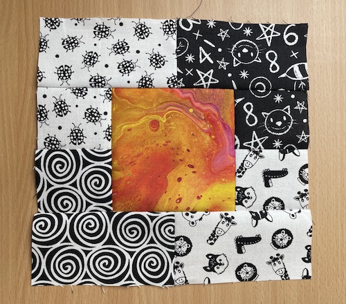 Forside » Gratis DIY og Inspiration » Patchworktæpper med danske bynavne 🇩🇰 » Restetæpper opdelt i de figure de er syet i » Restetæpper syet af 3 figurer » Sort-hvide firkanter med gult i midten. Grindsted restetæppe. Gratis DIY