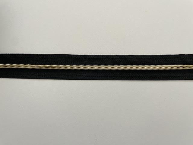 Sort lynlås med guld tænder i metermål – Et elegant valg til dine kreative projekter