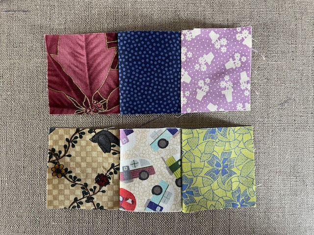 5 firkanter på hver 6 x 6 cm i reste farven og 1 blå ( bundstoffet) også på 6 x 6 cm