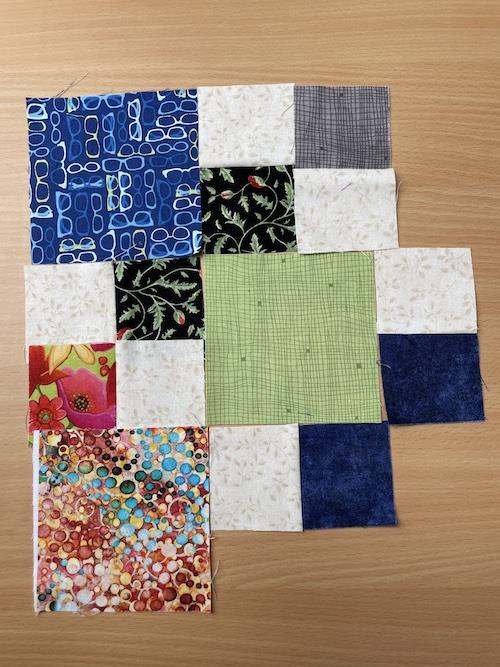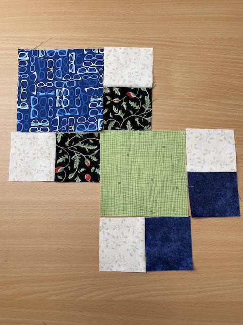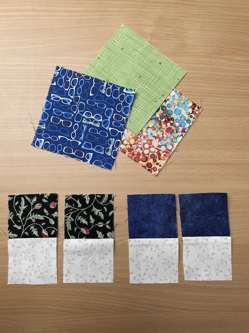 Jeg syr 4 små firkanter sammen inden jeg syr det sammen med den store firkant på 10.5 x 10.5 cm