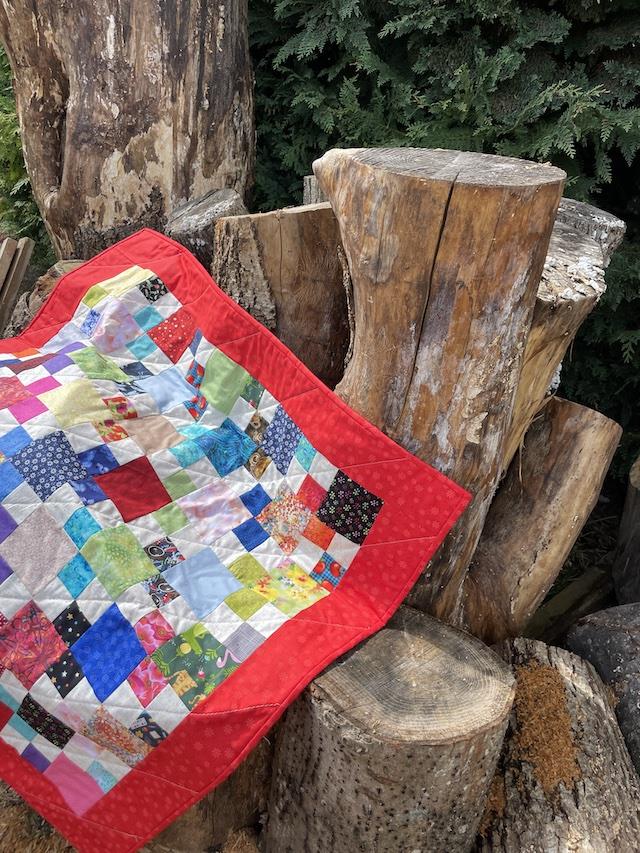 Jeg har syet en 10 cm rød kant uden om tæppet inden jeg samlede det med mellemfoer og bagside stoffet.