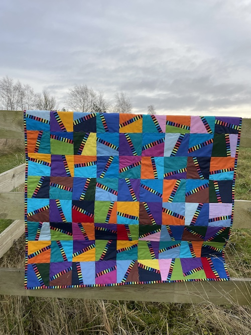 Forside » Gratis DIY og Inspiration » Patchworktæpper med danske bynavne 🇩🇰 » Restetæpper opdelt i de figure de er syet i » Restetæpper syet af 2 figurer » Stribet kryds giver smukt restetæppe - Rønnede tæppet