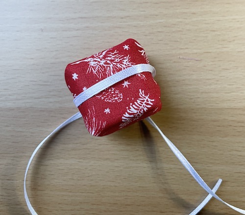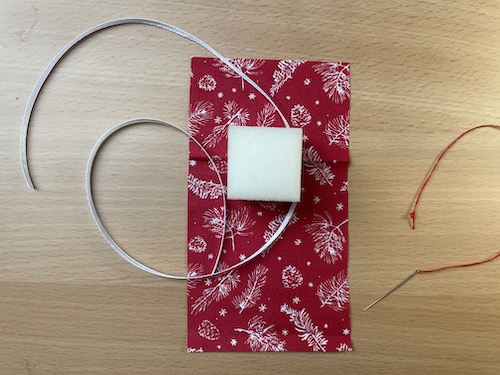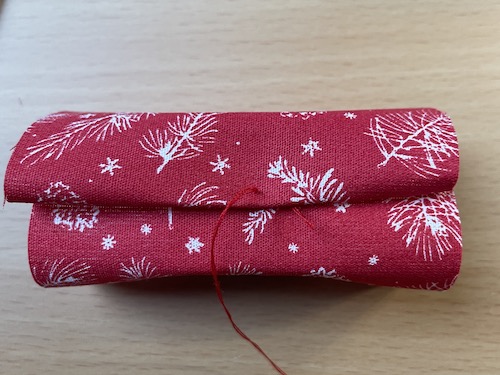 Start med rundt om pakken - sy lige et par sting med en sytråd og hæft det let.