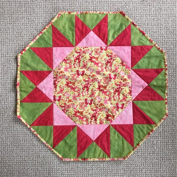 Her i dette Pedari patchworkmønster følger alle papskabeloner med, lige klar til at klippe ud og komme igang med at sy denne Sybilla dug som måler 62 x 68 cm, der er 8 kantet.