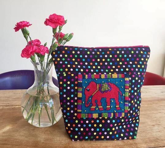 Det gør jeg gerne, og her får du billedet af min “Elefanttaske”, hvor det prikkede stof er købt hos dig engang for lang lang tid siden. Jeg har syet dem og broderierne er met egne design.