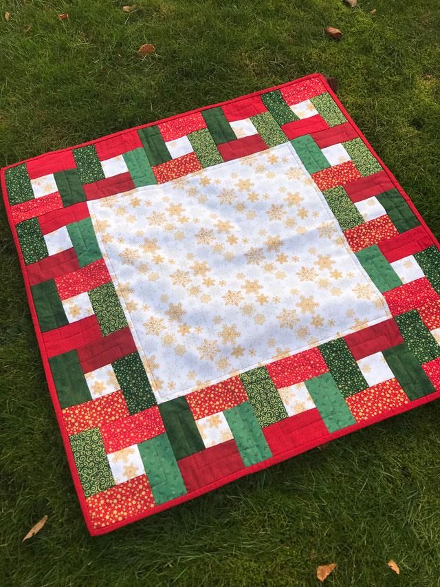 Tæppet er syet af to røde og to grønne stoffer rundt om det lyse stof.