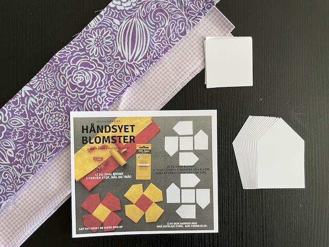 Denne pakke indeholder 2 farver stof som på billede og papskabeloner du skal bruge til 2 hele blomster.