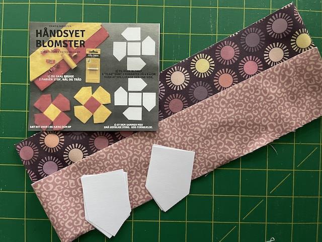 Denne pakke indeholder 2 farver stof som på billede 1 og papskabeloner du skal bruge til 2 hele blomster.