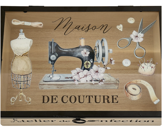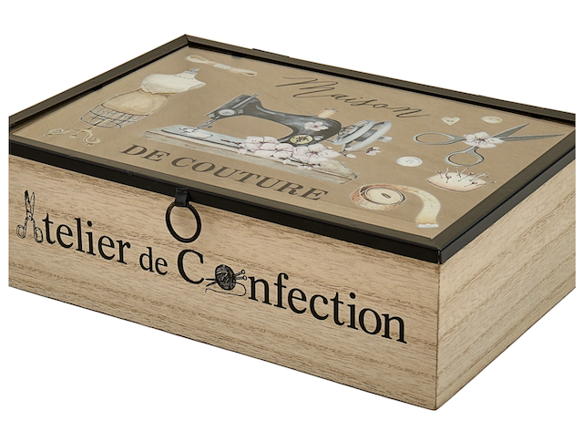 Denne elegante træboks er produceret i MDF og finer, hvilket giver både holdbarhed og et naturligt, varmt udseende. Låget er af klar acryl med en solid metalramme, der sikrer stabilitet og et moderne finish. På låget finder du et flot firefarvet print med motiver af symaskine, tråd og andet sytilbehør – perfekt til alle, der elsker patchwork og kreative projekter. Kombinationen af træ og acryl gør boksen både dekorativ og funktionel, og den passer smukt ind i et syværelse, patchworkatelier eller designrum.