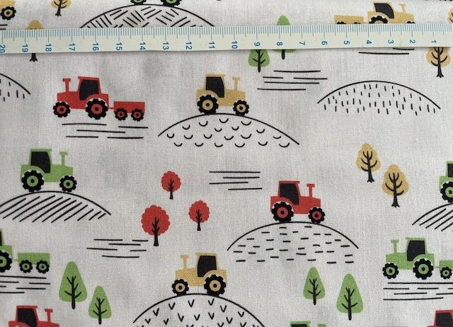 Er et flot bred lys bomuldsstof med flotte røde og gule traktor og søde træer