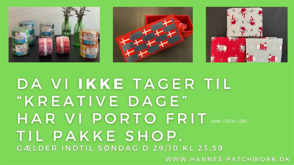 I denne weekend hvor der er Kreative dage i Fredericia, har vi derfor valgt at lave det portofrit hele weekenden, ved køb over 150 kr til pakkeshop i Danmark.