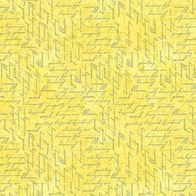 Dette smukke patchwork stof har en gul meleret bund med tekst i alle retninger.