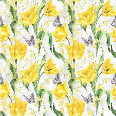 Dette smukke lyse patchwork stof har gule tulipaner, grønne blade og smukke sommer fugle.